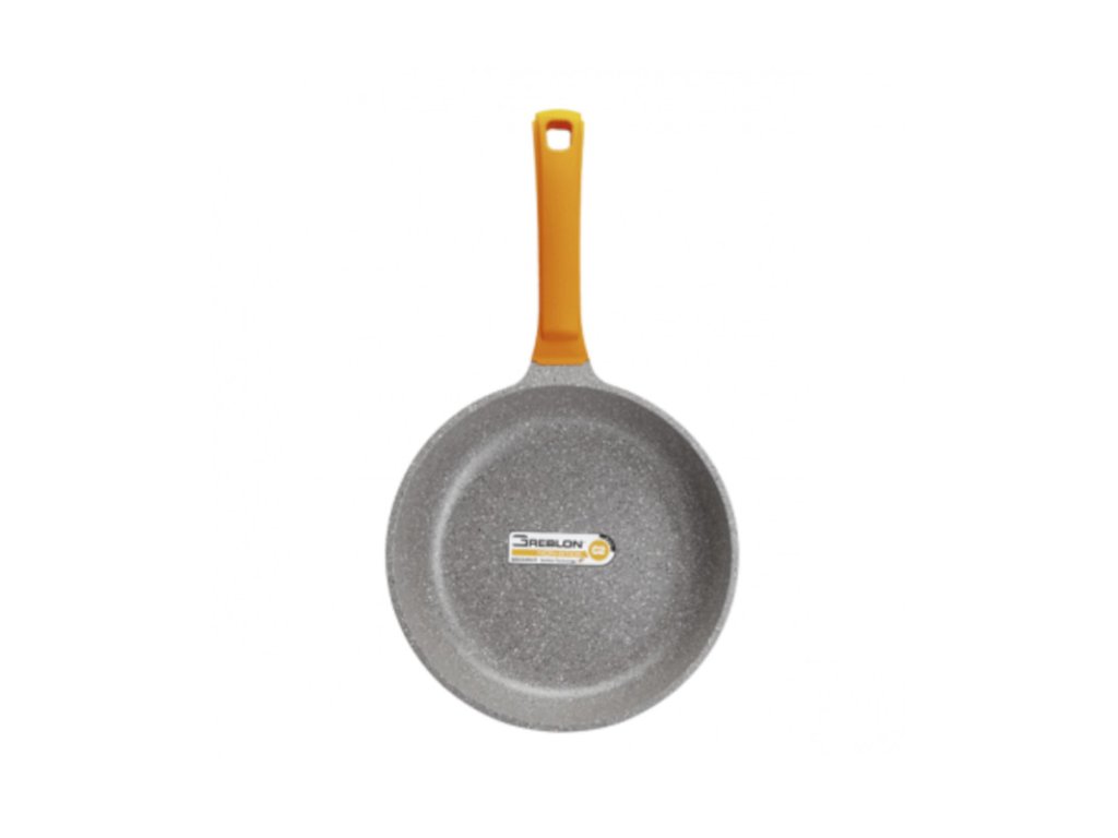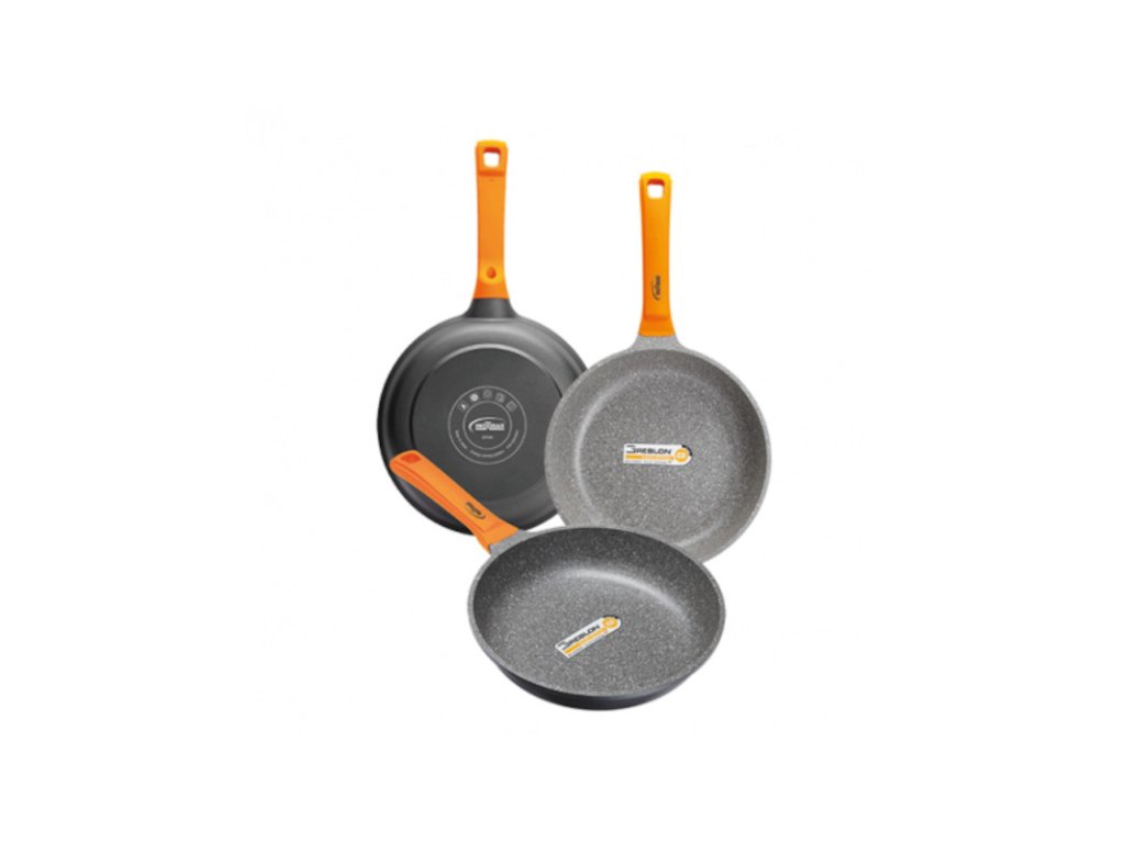 Povrchová úprava s kamenným efektem. Tento vkusný design doplňují veselé oranžové měkké rukojeti.