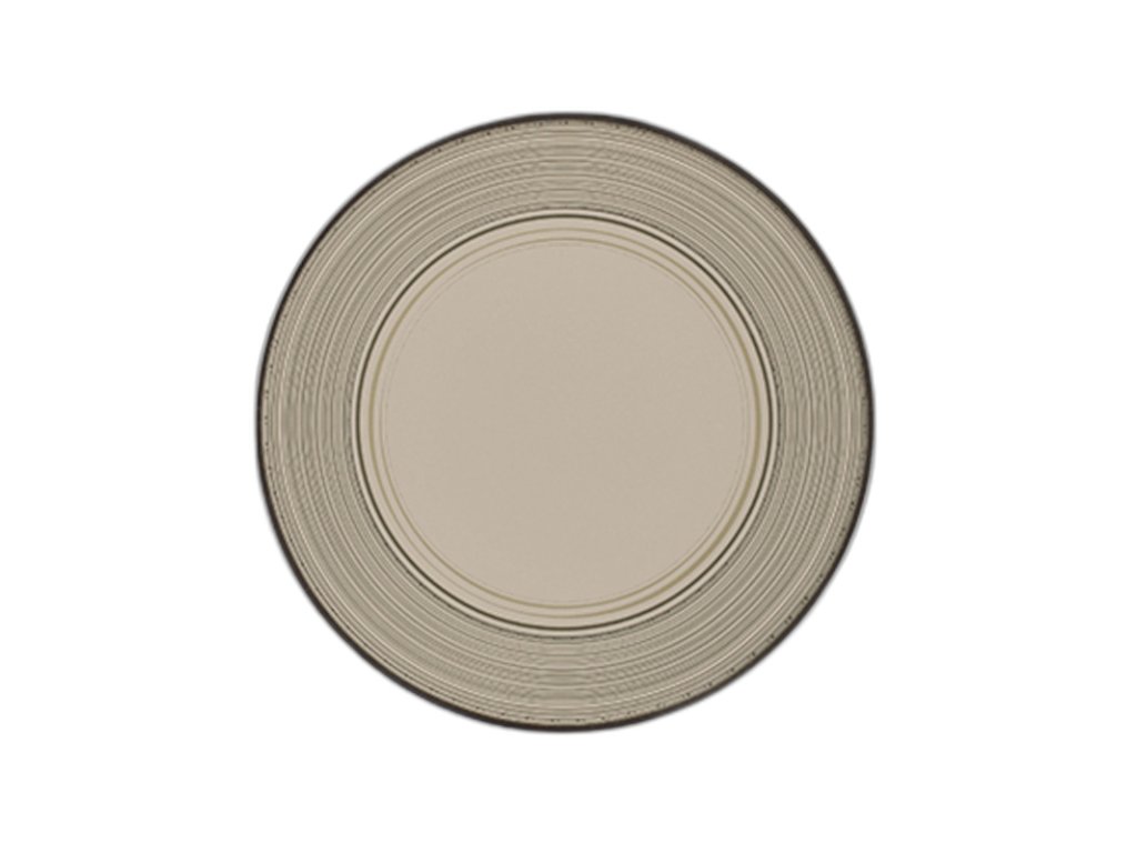 Kulatý mělký jídelní talíř vyrobený z prvotřídního porcelánu s hliněným povrchem a ručně aplikovaným zdobením.
