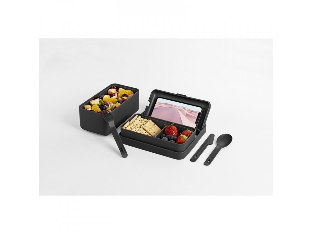 Vnitřní pohyblivý rozdělovač rozděluje potraviny tak, aby si zachovaly nejlepší chuť a konzistenci. Speciální větrací otvor umožňuje rovnoměrný ohřev a bezpečné použití v mikrovlnné troubě. Vzduchotěsný kryt s otvorem pro sluchátka nebo nabíjecí kabel se zároveň stane stabilním stojánkem na telefon. Snadné zavírání a otevírání nezpůsobuje trhání nebo pohyb potravin uvnitř. Další ochranou proti otevření je atraktivní popruh, který zároveň slouží k pohodlnému přenášení jídla. Lunchbox obsahuje také příbory (lžíce, vidlička a nůž), které jsou kompaktně umístěny na horní straně nádoby, těsně pod hlavním krytem.
