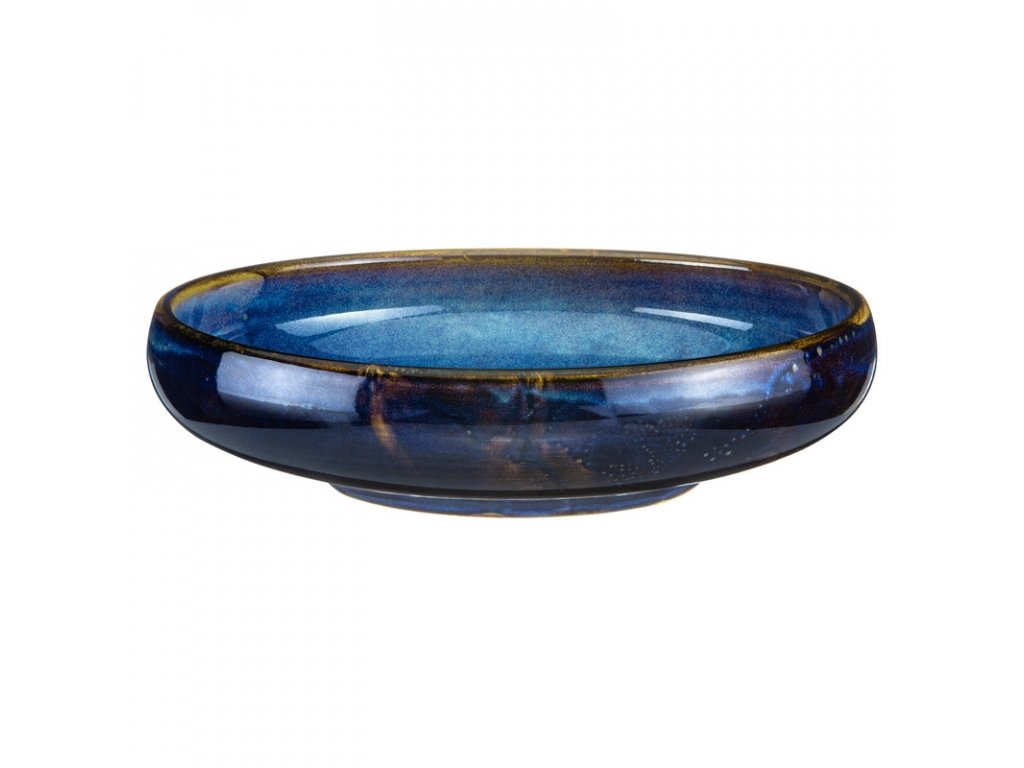Ultramarínová modř s měděnými okraji, to představuje nízkou bufetovou mísu z kolekce Deep Blue. 100% porcelán pokrytý působivým smaltem zaručuje jedinečný vzor získaný vypalováním v 1 380 °C. To také zaručuje velmi vysokou odolnost proti odštípnutí. Nízké okraje se hodí pro servírování sušenek, brambůrků či různých jiných dobrot.