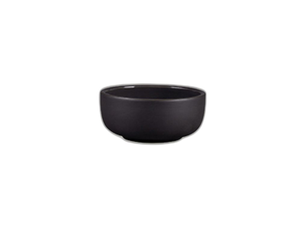 Kulatý ramekin vyrobený z prvotřídního porcelánu s matným antracitovým povrchem a lesklým černým vnitřkem.