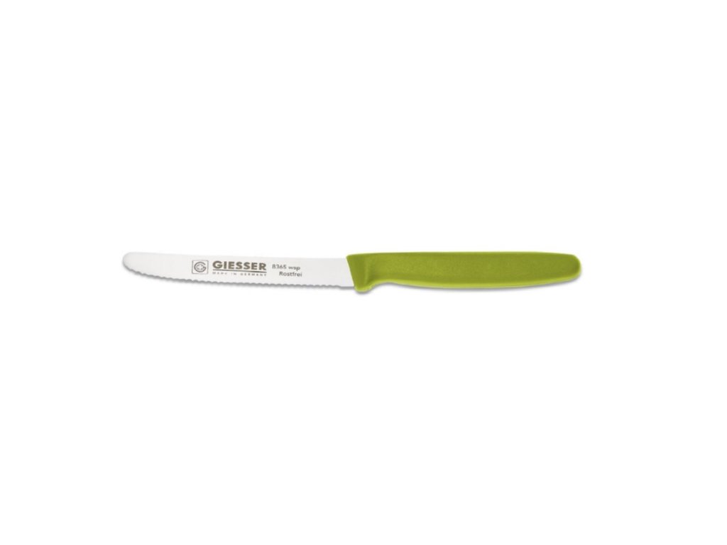 Univerzální nůž Fresh Colours od německého výrobce Giesser nesmí chybět v žádné kuchyni. Zoubkatá čepel se vyrábí z kvalitní nerezové oceli a plastová rukojeť dovoluje jednoduché uchopení. Pohodlně s ním tak nakrájíte ovoce, zeleninu i pečivo a můžete ho umýt v myčce.Nůž univerzální vroubkovaný 11 cm, limetkově zelený