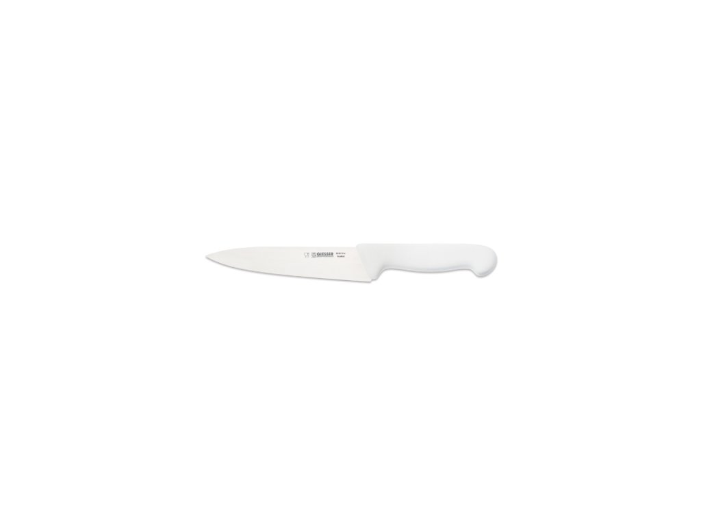 Tento kuchařský nůž od německého výrobce Giesser nesmí chybět v žádné kuchyni. Jeho čepel se vyrábí z vysoce kvalitní chrom-molybdenové oceli, která je kalená ve vakuu na tvrdost 56–57 podle Rockwella. Matně leštěný povrch zajišťuje nejvyšší možnou odolnost proti korozi a trvanlivost břitu. Úzký tvar se špičatou špičkou je univerzálně použitelný a také šikovný a lehký. Ergonomická a protiskluzová plastová rukojeť usnadňuje práci.Nůž kuchařský 16 cm, bílý