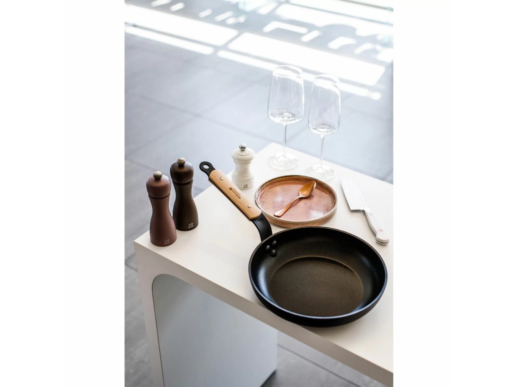 Hned na první pohled si jistě všimnete rukojeti. Je vyrobená z bukového dřeva z Vogéz a přinese do vaší kuchyně kousek přírody. Včelí vosk, kterým je ošetřená, vytvoří mimo jiné tepelnou izolaci a nespálíte se. Tělo pánve je vyrobeno z 4 mm kovaného hliníku, který je výjimečně pevný a v kombinaci feritické nerezové oceli zaručí rovnoměrné vaření. Použít můžete také v troubě při pečení maximálně 200 °C a 10 minut.