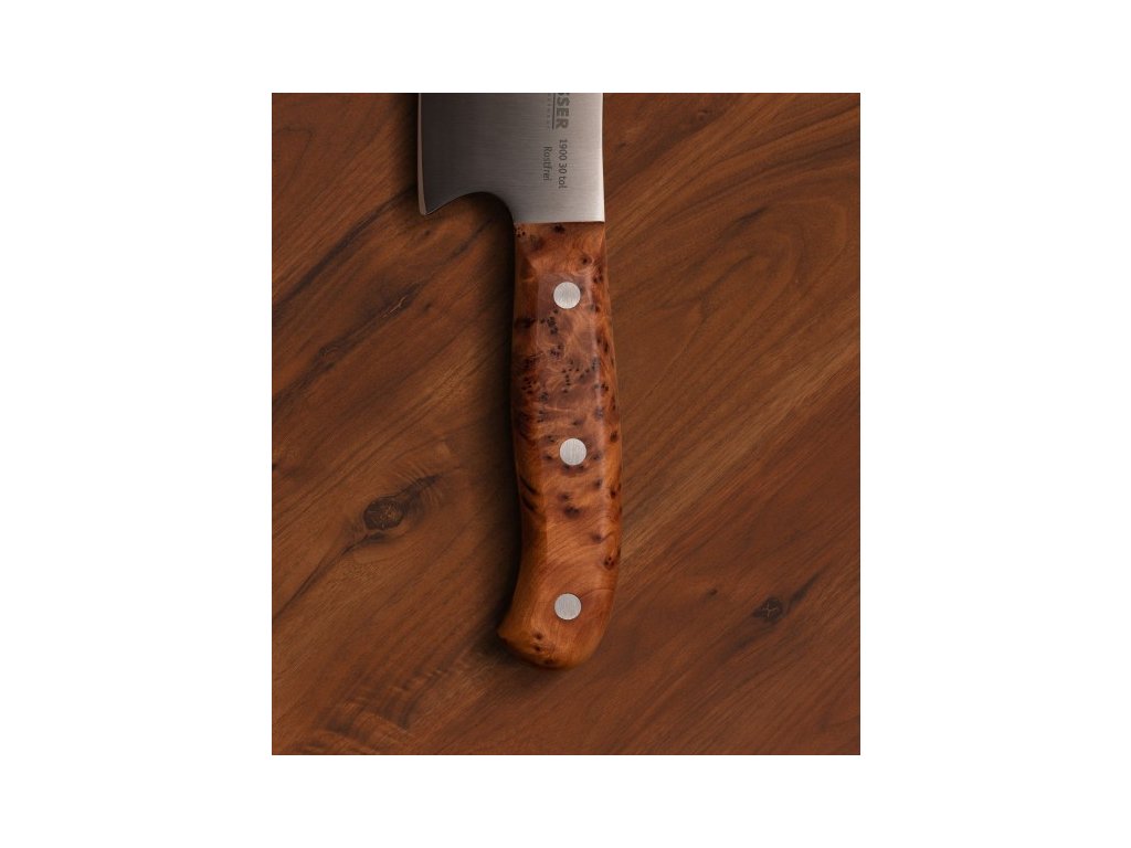 Rukojeti se vyrábí z velmi starého a obzvláště odolného dřeva Thuja burl. Thuja se často označuje jako strom života. A stejně tak rukojeti nože – každá má velmi zvláštní zrnitost a krásu. To vytváří pohodlný a bezpečný úchop a s noži se krásně manipuluje. Tato speciální série nožů kombinuje tradici a nejvyšší dokonalost. Zkrátka nože pro nejvyšší nároky v kuchyni.