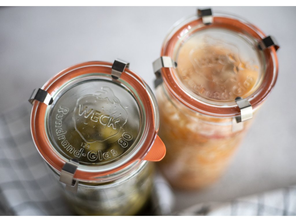 Sada 6 zavařovacích sklenic WECK Cylindric 1040 ml s víčkem, těsněním a klipy. Ideální na kompoty, okurky, fermentaci i stylové skladování.